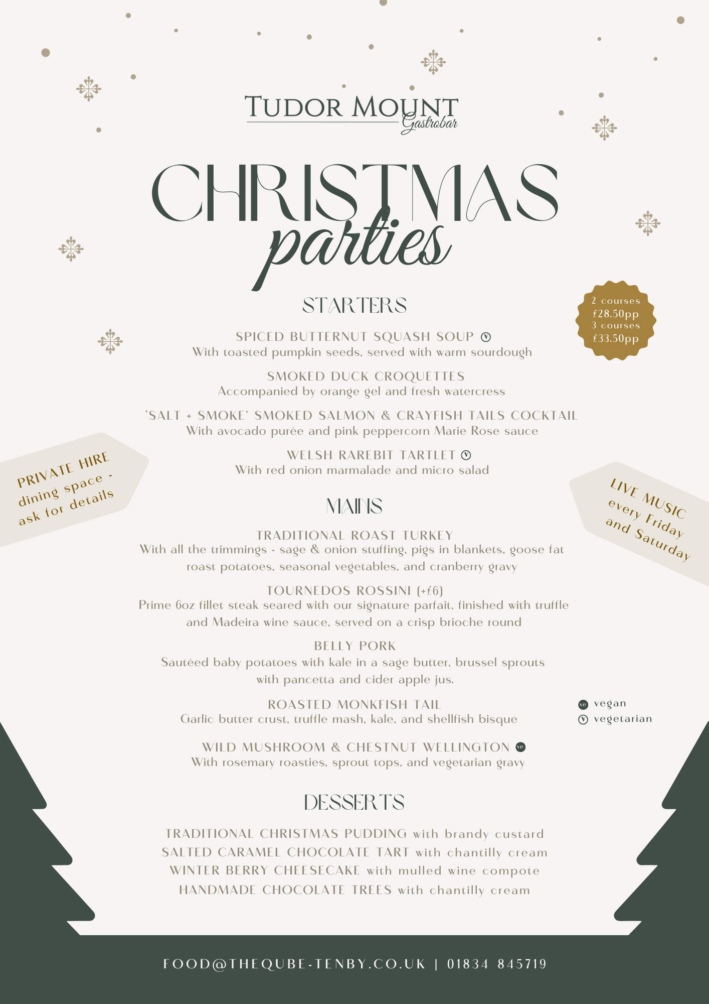 Celebrate the season with our festive Christmas Parties Menu – 2 courses £28.50pp, 3 courses £33.50pp.